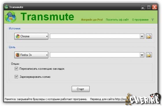 Transmute экспортирует закладки из одного браузера в другой, поэтому разбираться с их настройками не придется. С помощью Transmute закладки передаются из одной версии Firefox в другую (поддерживается как 2, так и 3), в Internet Explorer, Google Chrome и Opera. Нужно лишь выбрать исходный и целевой браузеры, и программа автоматически определит расположение закладок в каждом из них. А затем нажать на кнопку Export. При необходимости, Transmute переименует целевую папку и добавит к названию временную метку, что пригодится при создании резервных копий.