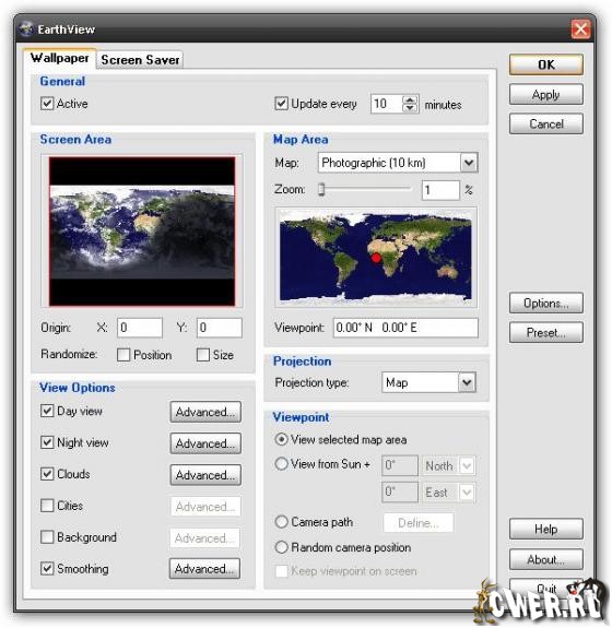 EarthView - это динамические обои и скринсейвер в виде карты нашей планеты или глобуса вращающегося синхронно с оборотом земли (поддерживает смену дня/ночи, облака, огни городов). EarthView может работать как скринсейвер, который создает высокодетализированные красивые виды земли (глобус или карта). Программу выделяют очень высокое качество изображения и насыщенные цвета. Все параметры генерации изображения гибко настраиваются, что позволяет подстроить качество изображения под производительность конкретного компьютера. С сайта разработчика можно скачать дополнительные (фотореалистичные) карты земной поверхности.