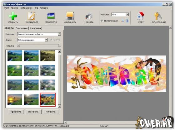 Эффекты можно комбинировать для создания действительно фантастических композиций. Выбранные фильтры применяются как ко всему изображению, так и к отдельным его частям, выделяя наиболее важный фрагмент фотографии. Мастер Эффектов поможет украсить домашний фотоальбом, веб-сайт и даже позволит создать оригинальную открытку.