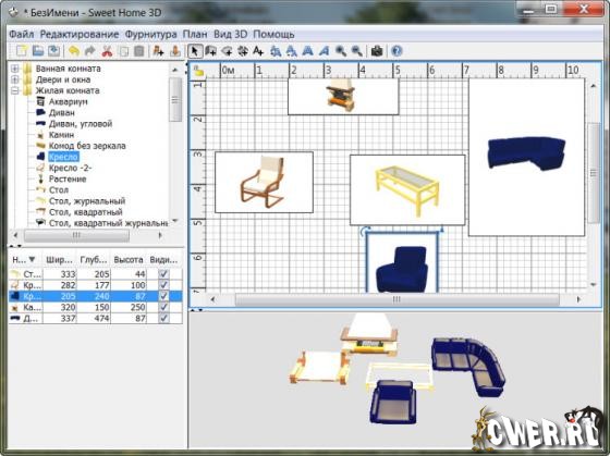 Программа предназначена для проектирования интерьера. Программа поможет вам виртуально расставить мебель по комнатам вашего дома, выбирая наиболее удачное расположение элементов интерьера.