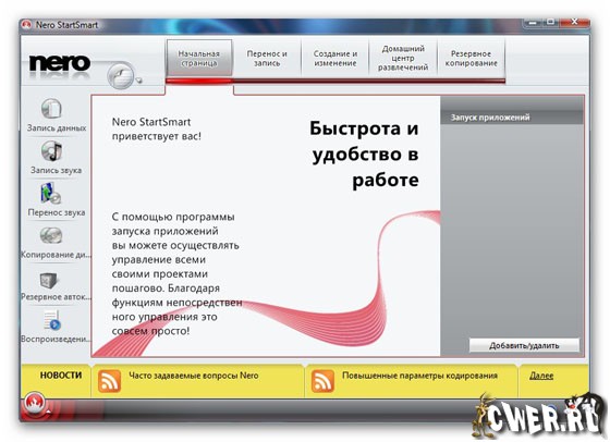 Nero Burning ROM - cамый свежий набор программного обеспечения цифрового мультимедиа и домашнего центра развлечений следующего поколения, которое пользуется наибольшим доверием в мире. Его характеризует передовая функциональность, благодаря которой наслаждаться цифровым мультимедиа так просто. Этот простой в использовании, но мощный набор мультимедиа дает вам свободу создавать, считывать, копировать, записывать, редактировать, совместно использовать и передавать данные в сети. Что бы это ни было — музыка, видео, фото или данные — наслаждайтесь ими и используйте совместно с родными и близкими когда угодно и где угодно. Ваша цифровая составляющая жизни еще никогда не была такой свободной, ощутимой и веселой, как с простым в использовании командным центром Nero StartSmart.