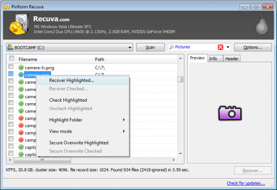 Recuva 1.34 build 451 (22.12.2009) - небольшая бесплатная утилита, которая предназначена для восстановления файлов, удаленных с ПК случайно или потерянных в результате программного сбоя или ошибки в работе приложений. Проста в использовании, не требует специальных знаний для успешного использования.