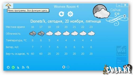 Weather Reader - бесплатная программа для просмотра прогнозов погоды. Некоторые особенности программы: прогноз до пяти суток и текущее состояние погоды для тысяч городов России, СНГ, мира.