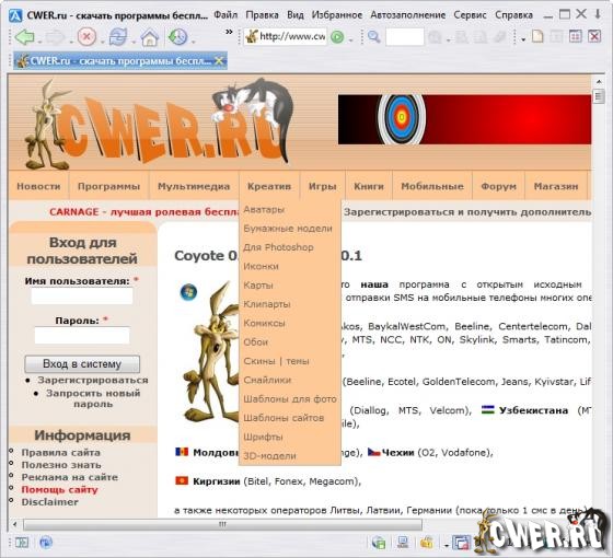 Avant Browser - браузер на основе Internet Explorer для расширения опций браузера и повышения комфортности интернет-серфинга, с отображением всех открытых веб-страниц в одном многовкладочном окне, автозакрытием рекламных окон, быстрым отключением / включением загрузки графики, удобным удалением временных интернет-файлов, интеграцией с поисковиком Google, скинами и сменными кнопками, подключением средней кнопки мыши, управлением мышью и т.д. Интерфейс меняется скинами (с домашней страницы можно скачать программку для создания своих собственных скинов).