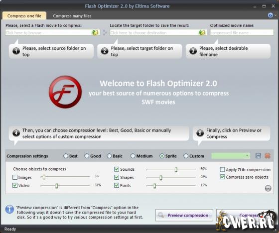 Eltima Flash Optimizer – лучшее программное решение для, веб-дизайнеров, веб-мастеров, Flash-профессионалов и всех кто когда-либо сталкивался с технологией Adobe Flash. Он позволяет уменьшить размер SWF файла на 60-70% благодаря алгоритмам векторов, образов, морфинга, Z-буфера, шрифтов и другой оптимизации. Flash Optimizer уменьшает размер не только какой-либо отдельной части Вашего Flash видеоролика, но и оптимизирует все его элементы (включая кривые, нулевые объекты, ZLib оптимизацию и др.).