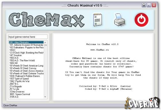 CheMax - наибольшая из известных на данный момент программ, которые являют собой базу данных с кодами для игр. Простой и красивый интерфейс, малый размер, и при этом огромное количество представленных игр. Особенностью базы является отсутствие в ней хинтов и прочей “отсебятины“, вашему вниманию представлены только коды (cheats, hex-cheats) и пароли (passwords).