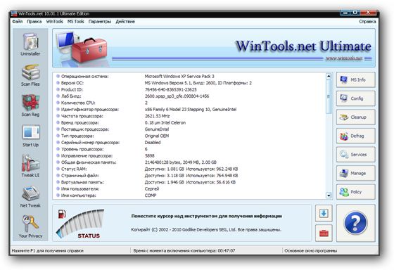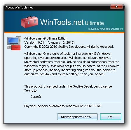 WinTools.net – набор инструментов для оптимизации операционной системы Windows. В состав программы входят компоненты для полного удаления нежелательных программ и «мертвых» ссылок реестра, а также для контролирования процессов, настройки системы, интернет-соединений и интерфейса. В состав программы входят следующие инструменты: Clean Uninstaller, Scan Files, Scan Shortcuts, Scan Registry, Startup Manager, Tweak UI, Net Tweaker, The Privacy, Invisible Man, File Shredder. Кроме того, имеются утилиты для надежного хранения конфиденциальной информации. Работает на платформах Windows 2000, 2003, XP и Vista.