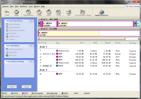 EASEUS Partition Master Server Edition is an ALL-IN-ONE server partition solution and reliable server disk management toolkit. It performs needed hard disk partition maintenance, provides powerful data protection and disaster recovery, and minimizes server downtime to increase the efficiency of Windows-based system administration. The flawless hard disk management functions are brought together for Windows Server 2000/2003/2008 and Windows 2000/XP/Vista/Windows 7 including: Partition Manager, Partition Recovery Wizard and Disk & Partition Copy Wizard, with all hardware RAID supported.