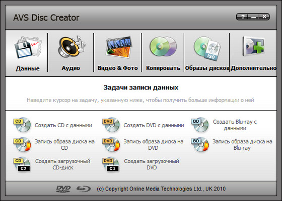 AVS Disc Creator программа для записи данных на диски. AVS Disc Creator имеет удобный и функциональный интерфейс в стиле Проводника Windows. С одной стороны рабочего окна программы содержимое диска, а с другой стороны - дерево каталогов компьютера. Поддерживается работа с дисками форматов CD-R/RW, DVD+/-R, DVD+/-RW, DVD-RAM, Double/Dual Layer DVD, а также с новыми форматами Blu-Ray BD-R и BD-RE. AVS Disc Creator способен записывать диски с мультисессией, в том числе и на DVD носители. Кроме обычной записи возможно создавать образы дисков (ISO). Во избежание потери данных на записанных дисках качество записи можно проверить средствами программы.