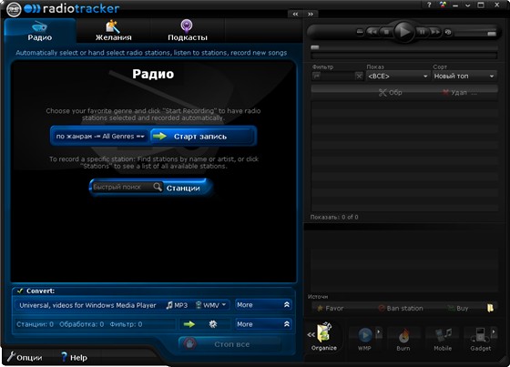 Radiotracker Platinum - программа использующая около 15.000 интернет-радио станций для прослушивания и записи музыки в формате mp3. Возможности программы довольно велики: поиск нужной музыки, разбивка на разные жанры (Dance/House, Pop, Rap, Rock, Techno, Metal, Jazz, 80s, 70s и т.д.), во время сохранения треков сохраняется и вся информация об исполнителе и прочая полезная информация, возможность использования фильтров для очистки от рекламы и прочих шумов на радио. Программу Radiotracker обслуживает база данных, в которой хранятся файлы восьми тысяч онлайн-радиостанций со всего мира. Больше, по сути, и не нужно, потому что здесь есть радиостанции буквально на любой музыкальный вкус.