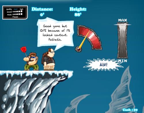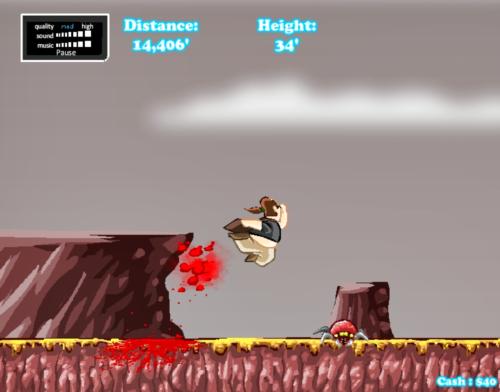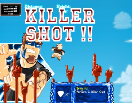 Ваша задача - закинуть толстого парня как можно дальше в лес. Зарабатывайте деньги, чтобы покупать модернизации. Используйте мышку, чтобы определить угол и силу удара. Также можно управлять толстяком в воздухе, нажимая на левые и правые клавишы-стрелки.