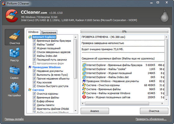 CCleaner, в зависимости от настроек, чистит следующие компоненты Windows: