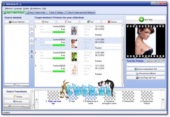 Slideshow XL - программа для легкого и быстрого создания слайд-шоу из ваших фотографий. Полученное слайд-шоу можно записать на DVD и просмотреть на домашнем DVD проигрывателе. При создании слайд-шоу на каждое изображение вы сможете накладывать различные эффекты перехода, текстовую информацию, указать продолжительность показа картинки, а также быстро отредактировать каждую фотографию во встроенном редакторе изображений. Кроме того в программе имеется возможность добавления фоновой музыки. Готовое слайдшоу можно записать на диск, сохранить в видео-файл и загрузить его в интернет (например на YouTube), использовать в качестве заставки, а также записать на DVD и просмотреть на домашнем DVD проигрывателе.