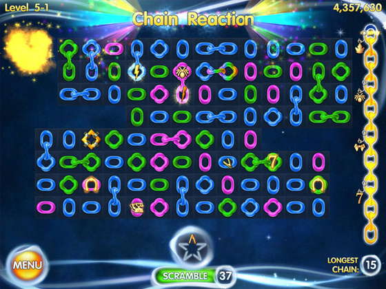 Меняйте разноцветные звенья, чтобы составить сочетания из трех или более одинаковых звеньев. Убирайте совпадения с поля и создайте красочный связанный мир! Наслаждайтесь четырьмя новыми режимами игры, которые позволят проверить вам свой игровой опыт! Играйте в неторопливом темпе, пока вы не исчерпываете комбинации или состязайтесь на время, чтобы составить так много совпадений, насколько это возможно! Увеличивайте счет при помощи восьми захватывающих бонусов, соберите множество наград и добейтесь больших успехов в увлекательной игре Chainz Galaxy!