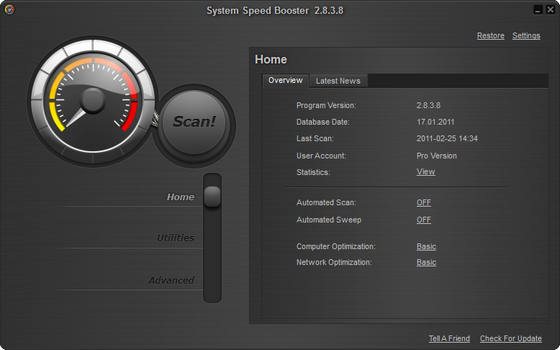 System Speed Booster - представляет собой набор мощных безопасных утилит, служащих для тонкой настройки работы операционных систем семейства Windows. Программа может оптимизировать работу как целой ОС, так и определенного приложения, посредством изменения огромного количества настроек и параметров (в том числе и скрытых, то есть недоступных обычным способом), а также найдет ошибки, которые можно устранить нажатием одной кнопки, имеет аккуратный и легкий в использовании интерфейс. При помощи данной программы Вы можете выучить техническую информацию своего персонального компьютера и управлять параметрами настройки, а также пользоваться другими легкими и удобными функциями. Программа способна оптимизировать Ваш компьютер и держать его при пиковой производительности, а также защитить Вашу личную информацию.