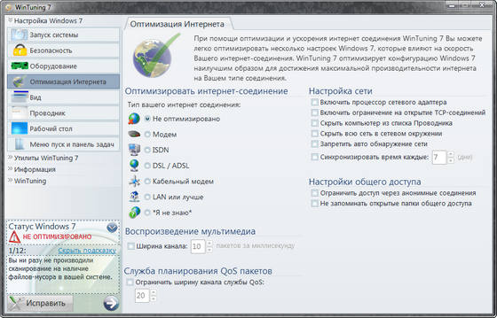 Программа WinTuning 7 предназначена для настройки и оптимизации Windows 7, улучшения её безопасности, удаления файлов-мусора с жесткого диска, уменьшения времени запуска компьютера и используемых программ. Позволяет настраивать загрузку и завершение работы компьютера, ядро системы, ускорять Интернет-соединение, редактировать скрытые настройки основных элементов Windows 7: рабочий стол, контекстные меню, проводник, панель задач, меню пуск и т.д. Для всех настроек есть текстовые подсказки, а для некоторых также отображается картинка, позволяющая просмотреть включенную настройку в действии.