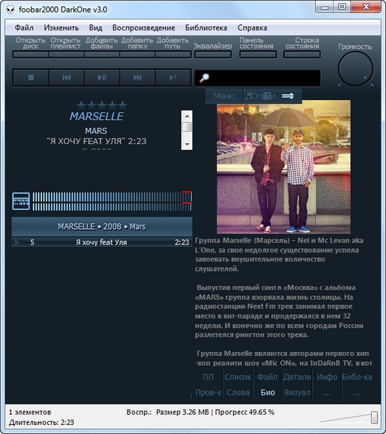 foobar2000 - аудиоплеер, основные черты которого качественный звук, широкие возможности настройки, спартанский интерфейс и низкие системные требования. Foobar проигрывает файлы форматов MP1, MP2, MP3, MP4, MPC, AAC, Ogg Vorbis, FLAC / Ogg FLAC, WavPack, WAV, AIFF, AU, SND, CDDA, WMA (lheubt форматы могут поддерживаться при установке соответствующих плагинов). Имеется полная поддержка unicode. В программе использован новый формат плейлистов (m3u8) и поддерживается чтение APEv2-тэгов из файлов MP3 (id3v2 не поддерживается).