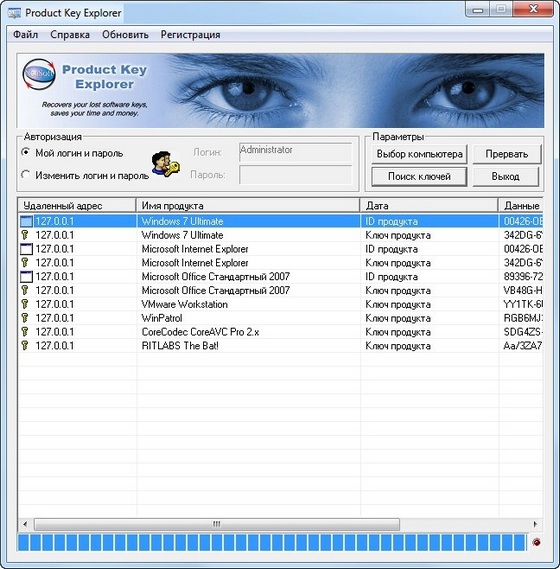 После запуска программы достаточно будет нажать Find Keys и она сама просканирует реестр, и выдаст список программ, установленных на компьютере и регистрационные данные к нем. В программе есть окно для авторизации Администратора, если установлены ограничения на уровне пользователей. Может работать по сети с другими компьютерами и по заданному диапазону IP адресов или по списку IP в текстовом документе.