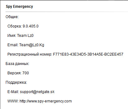 Spy Emergency - программное обеспечение, которое быстро и безопасно находит и удаляет шпионские модули, программы-рекламы и другие вредоносные программы из вашего компьютера. Вы боитесь хакеров или шпионские программы, тогда установите данную программу и будьте уверены, что вы защищены от вмешательства в ваши личные дела, связанные с компьютером. Программа сканирует системную память, реестр, отдельные директории, файлы кукисов в поиске вредоносных программ и шпионских модулей. Утилита в реальном времени анализирует и защищает память компьютера. Интерфейс программы ненавязчив и прост, а функциональность и быстродействие программы просто поражают воображение. Имеется мультиязычная поддержка, включая поддержку русского языка.