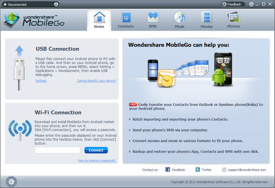 Wondershare MobileGo - незаменимый инструмент, позволяющий пользователю эффективно управлять Android-смартфонами при помощи персонального компьютера. Приложение предоставляет возможность синхронизации через беспроводное соединение или по USB-кабелю содержимого телефона, управления контактами, мультимедийными файлами, SMS-сообщениями и приложениями, позволяет осуществлять конвертацию видеофайлов, с целью их просмотра на мобильном устройстве, а также упрощает процесс резервного копирования и восстановления данных.