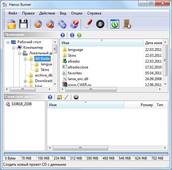 Hanso Burner - программа для записи CD / DVD с расширенными возможностями. Hanso Burner это простота и удобство записи - нет переполненных вкладок, лишних окон, значков или других бесполезных функций, которые могут вас запутать. В главном окне программы представлено 6 значков с основными функциями программы, а так же панель инструментов, которую можно настроить по своему усмотрению.