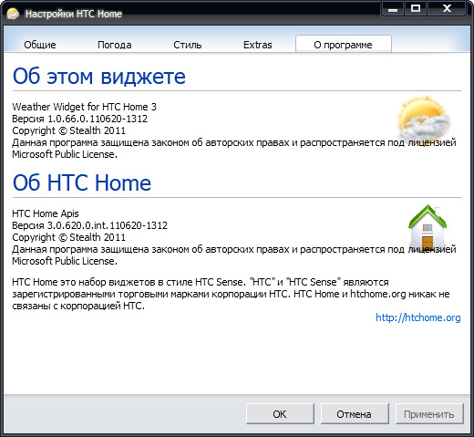 HTC Home Extras – это различные дополнения, которые расширяют функциональность виджетов. Это могут быть провайдеры погоды, ресурсы и т.д. Для установки дополнений, просто перетащите их на исполняемый файл любого виджета (Clock.exe, Weather.exe). Удалить их вы можете в настройках, на вкладке Extras.