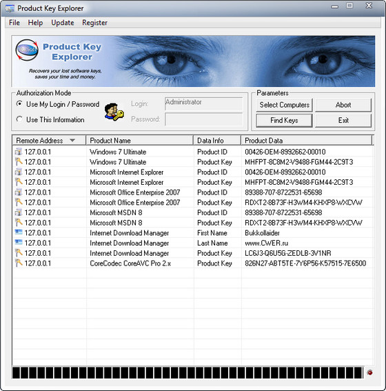Product Key Explorer быстро восстанавливает и показывает ключ продукта для Windows 7, Windows Vista, Windows XP, Microsoft Office, Adobe Photoshop, Adobe CS5, CS4, CS3, SQL сервер, игры Electronic Arts и больше чем 3000 популярных программных продуктов, установленных в сетевых компьютерах.