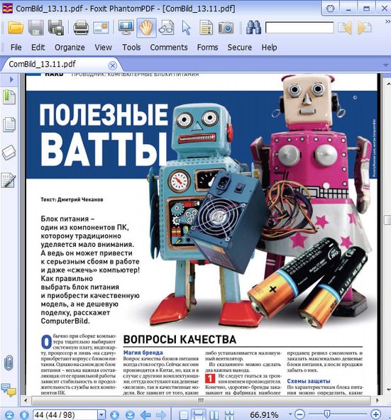 Foxit Phantom - это новая программа для просмотра, редактирования и создания PDF документов. Программа сможет стать отличной заменой для известного монстра Adobe Reader. Среди главных преимуществ программы разработчики указывают на ее небольшой размер, малое время запуска и более высокую скорость создания PDF-документов. С помощью программы вы сможете также сливать и разделять PDF документы, удалять и вставлять новые страницы, создавать электронные формы и примечания и многое, много другое. Программа позволяет конвертировать почти все документы, которые могут быть распечатаны на принтере в формат PDF, включая файлы DOC, PPT, TXT, HTML и многие другие. Также вы сможете создавать PDF документы напрямую со сканера, позволяя без лишних усилий создавать электронные версии бумажных документов.