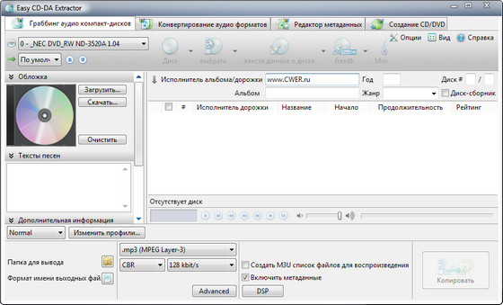 Easy CD-DA Extractor - программа для преобразования аудио-CD в качественные цифровые аудиофайлы, а также для записи MP3, WAV MP4, Windows Media Audio, FLAC, Ogg Vorbis, AAC и Monkey-s файлов на аудио-CD. Допускается преобразование аудиотреков непосредственно в MP3, WMA, VQF, OGG или WAV и конвертирование из одного аудиоформата в другой.