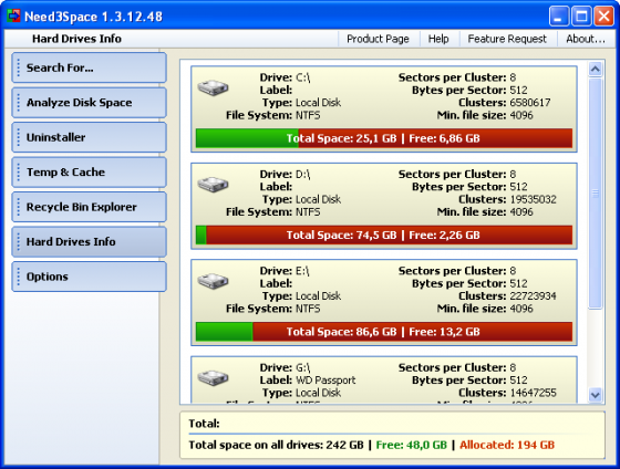 Need Free Space will locate unneeded file on any drive (hard disks, external hard drives, CD-ROM, DVD-ROM, Network drives, USB storage devices (USB hard drives), portable hard drives, and memory disks). Files can be deleted directly or sent to the Recycle Bin where they can be later purged using Windows Recycle Bin or extended Recycle Bin Explorer integrated in Need Free Space.