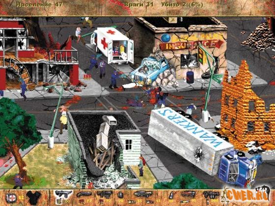 Поначалу действие кажется невероятно сумбурным. Когда первые литры кровищи прольются на нарисованный асфальт, Вы осознаете, что Postal — стратегическая игра. Попытка одолеть уровень на счет "раз" терпит оглушительное фиаско: чувак, потяжелевший от свинца, валится на землю. Неприятель повсюду — в кустах, за машинами и домами, ждет в подворотнях, прячется за заборами. Есть еще, правда, мирное население: фригидные дуры, учившиеся с вами в школе, негры, страусы, очкарики-импотенты и пенсионеры. Но запомните: жалость — удел слабых. Война все спишет.