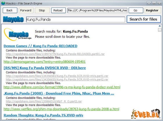 Обновился специальный "движок" для поиска ссылок на программы, музыку и фильмы связанных с супер-мега-шаре ресурсом №1 в Мире - RapidShare! Трудно найти человека который был бы с ней не знаком. Буквально миллионы файлов, скачиваются с RapidShare каждый день. Но есть одна проблема, на RapidShare закрыт доступ к поиску своих файлов. И вот, решение найдено! - Mayoko позволит вам найти эти миллионы файлов в Интернете относящиеся к ресурсу RapidShare, будь то фильмы, музыка или программное обеспечение, - вы все сможете найти. Все что вам нужно сделать, это ввести ключевые слова, например, название фильма, имя исполнителя, композицию или название альбома, и так далее, и вам будет представлен полный список с результатами. Программа позволяет вести поиск из 3,5 Petabytes (а, это 3500000000000000 байт!) файлов, которые хранятся на серверах RapidShare. Отныне, независимо где бы файл не хранился, который вы ищите, вы увидите его!