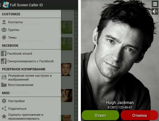 - Полная версия Full Screen Caller ID поддерживает интеграцию с соц. сетью Facebook, и если ваши контакты из телефонной книги зарегистрированы в ней, то фотографии с их профилей автоматически синхронизируются и добавятся.