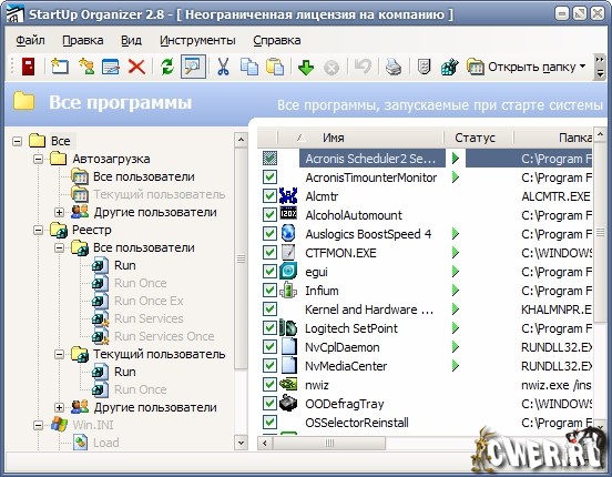 Программа Startup Organizer выводит полный список приложений, запускающихся с помощью стандартных средств автозагрузки Windows, реестра, в качестве служб. С помощью данной программы возможны изменения списков автозагрузки всех пользователей, чьи учётные записи присутствуют в системе (естественно, при условии активной учётной записи администратора).