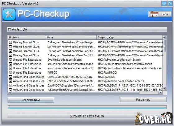 PC-Checkup 4.0 служит для анализа компьютера на наличие ошибок, в результате которых замедляется его работа и проявляется нестабильность. PC-Checkup предельна проста. Всего один клик мышью и в течении нескольких минут все ошибки на компьютере будут найдены и исправлены.