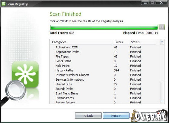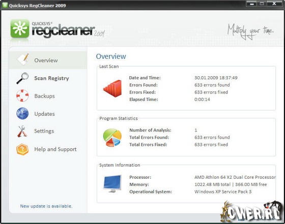 Quicksys RegCleaner 2009 scans the Windows® registry and finds incorrect information. You can safely clean, repair and optimize the Windows® registry by fixing this errors. Your system will run faster, will be more stable. The software will quickly, easily and safely detect and remove invalid references in Windows® registry. Lot of invalid entries that cause system complications and slow down your computer significantly.