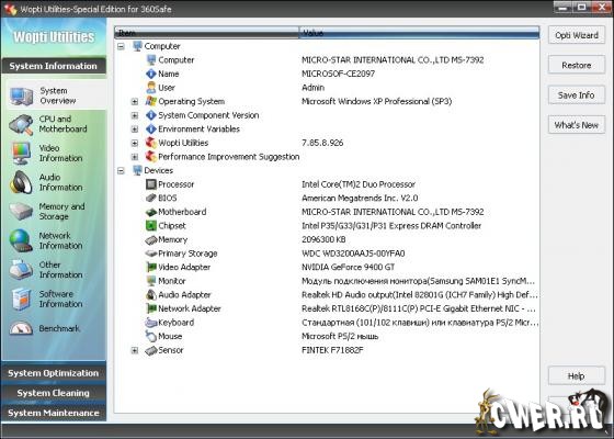 Wopti Utilities - программа, представляющая собой системный пакет утилит "все-в-одном" для оптимизации, очистки, поддержки и ускорения вашей системы. Кроме того, программа предоставляет полное описание об аппаратных устройствах и установленном программном обеспечении в системе для полного понимания вашего компьютера. В комплект данной программы входит более 30 утилит, расположенных в четырех разделах (Системная информация, Системная оптимизация, Очистка системы и Обслуживание системы), созданных для полной поддержки и оптимизации производительности вашего компьютера. В целом, программа выполняет поставленные перед ней задачи по ускорению процедуры запуска операционной системы, вывода информации об установленном программном и аппаратном обеспечении, а также информацию о температуре чипсетов и показатели оборотов на кулерах. Обладает привлекательным и понятным в использовании пользовательским интерфейсом.