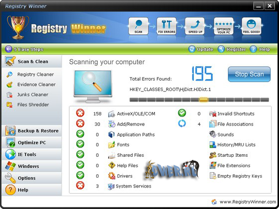 С использованием Registry Winner на регулярной основе ваша система будет поразительно стабильна. Registry Winner сканирует весь компьютер на возможные ошибки, которые ведут к проблемам в реестре. Происхождение у них может быть разное, но для программы это не имеет значения – она справиться со всем легко и быстро.