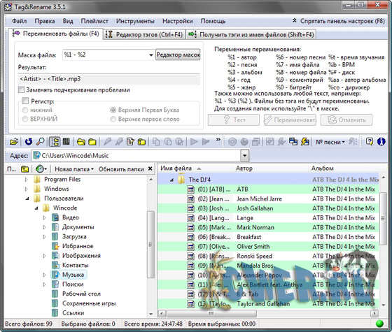 Tag&Rename - программа, предназначенная для ручного управления музыкальными файлами. С помощью данной утилиты Вы сможете быстро и легко переименовать вашу музыкальную коллекцию, используя встроенную информацию в тегах, создавать новые или редактировать существующие теги, а также создавать теги, основанные на именах файлов...