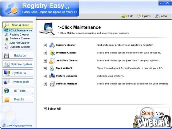 Registry Easy – программа для очистки системного реестра и оптимизации системы для повышения эффективности её работы. Утилита позволяет сканировать систему и производить удаление ошибочных и недействительных записей, тормозящих работу системы. Используя специальный алгоритм, программа способна быстро идентифицировать утерянные или поврежденные файлы и удалять ссылки на них в реестре. Программа устраняет ошибки, возникающие из-за некорректной работы инсталляторов, ошибки javascript и Internet Explorer, а также связанные с элементами управления ActiveX. Перед началом оптимизации программа создает резервную копию существующего реестра. Любые изменения, сделанные при помощи данной утилиты, можно отменить, вернув систему в исходное состояние.