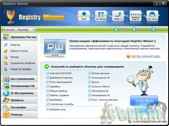 Registry Winner – программа для улучшения работы компьютера, которая находит ошибки, оптимизирует систему и ускоряет ее. Вы можете столкнуться с различными проблемами, которые постепенно появляются с использованием компьютера, например, замедление, зависание, «голубой экран смерти», постоянные сообщения об ошибках и т.д. Registry Winner использует только самые продвинутые технологии для сканирования ваших жестких дисков и дает вам наиболее полную диагностику всего за несколько секунд. Как только проблемы обнаружены приложением, Registry Winner предложит вам профессиональное и высокоэффективное решение для вашего компьютера.