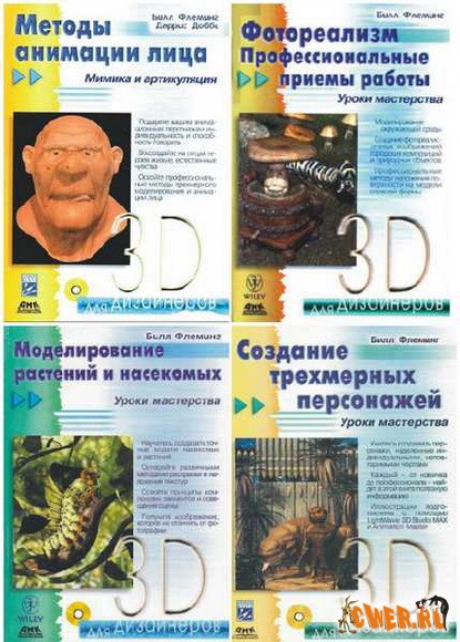В книге "Методы анимации лица" описаны профессиональные методы трехмерного моделирования и анимации лица. Книга "Фотореализм. Профессиональные приемы работы" расскажет о моделировании окружающей среды, создании фотореалистичных изображений, и методах наложения поверхностей на сложные формы. Научитесь создавать точные модели насекомых с книгой "Моделирование растений и насекомых". С книгой "Создание трёхмерных персонажей" Вы научитесь создавать неповторимые, наделённые индивидуальными чертами 3D персонажи.