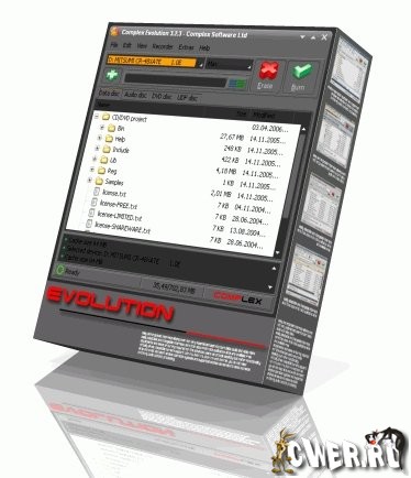 Complex Evolution - это программа для записи всех типов дисков CD/DVD, включая загрузочные и UDF, а также записи образов, включая mds - Alcohol 120%. Ее отличает уникальная легкость в освоении даже для неподготовленного пользователя. Разработчики сознательно отказались от каких-либо второстепенных свойств и сосредоточились на двух основных требованиях - простоте и удобстве использования. Однако это не сказалось на качестве работы программы, где ее основные функциональные возможности оказались на уровне (а зачастую и выше) более сложных программных продуктов.