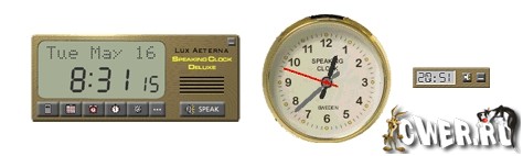 Speaking Clock Deluxe - одна из множества популярных утилит загружаемых в интернете, которая не только превращает ваш компьютер в говорящие часы с поддержкой около 30 языков, по умолчанию 5-ти, включая русский, но и имеет говорящий калькулятор, таймер прямого и обратного отсчета, 50 будильников с различной переодичностью повторения, ежечастный сигнал, атомный синхронизатор системного времени, гибкие внешние настрой, "говорилку" - функция перевода текста в речь и многое другое. Дополнительные языковые модули можно загрузить с сайта компании.