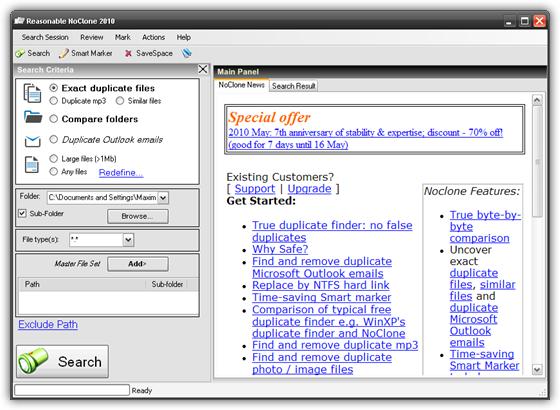 NoClone 2010 Enterprise — программа для поиска и удаления дубликатов файлов на отдельном компьютере или в локальной сети. За считанные минуты данная программа обнаружит все дубликаты на всем жестком диске или в указанном месте. Сравнение файлов происходит не через CRC, а побайтово. В зависимости от степени вашей решимости проводить генеральную уборку, можно назначать поиск файлов по побайтовому сравнению, по названиям или просто по «внешней» схожести. Программа может проводить поиск повторяющихся файлов любого формата, от библиотек DLL до файлов формата MP3. Если процедура поиска занимает много времени, ее можно продолжить в следующий раз, сохранив результаты текущей сессии в формате CSV. NoClone 2010 позволит вам эффективно освободить место на жестком диске и навести порядок, удалив ненужные дубликаты файлов.