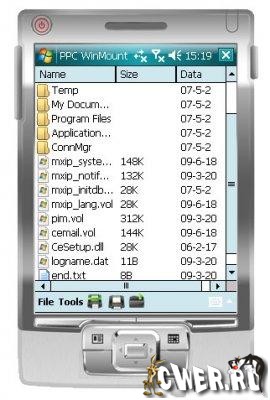 WinMount - архиватор для Windows Mobile. Поддерживает архивы ZIP, MOU, а также разархивацию RAR. MOU — архивы высокой степени сжатия от WinMount International, быстро разархивируются.