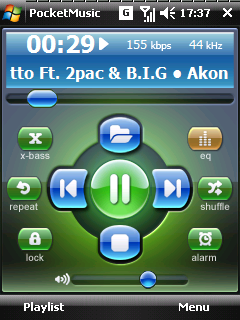PocketMusic Player - продвинутый аудио-плеер с 10-полосным эквалайзером проигрывает музыку в форматах MP3, Ogg Vorbis и WMA. Есть вариант интерфейса с крупными кнопками, ориентированный на работу в горизонтальном положении экрана.