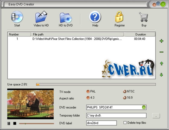 Easy DVD Creator - простой и удобный инструмент для конвертирования AVI/DIVX/XVID/DIV, MPEG/MPG/DAT, WMV/ASF/ASX, RM/RMVB, MOV/QT, 3GP/3G2, MP4/M4V, и FLV в DVD, которые вы сможете посмотреть на обычном домашнем DVD-плейере. С помощью Easy DVD Creator вы сможете превратить фильмы о ваших путешествиях, свадьбах, домашних торжествах в DVD, которые можно показать друзьям и семье! Просто добавьте видео-файлы в список файлов конвертера и нажмите кнопку "Start".